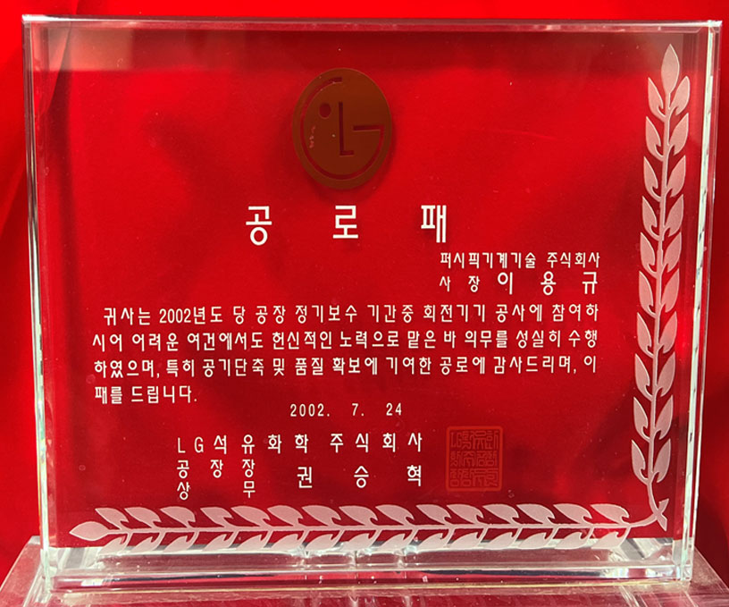 LG 석유화학 주식회사 공로패 2002년 7월 24일